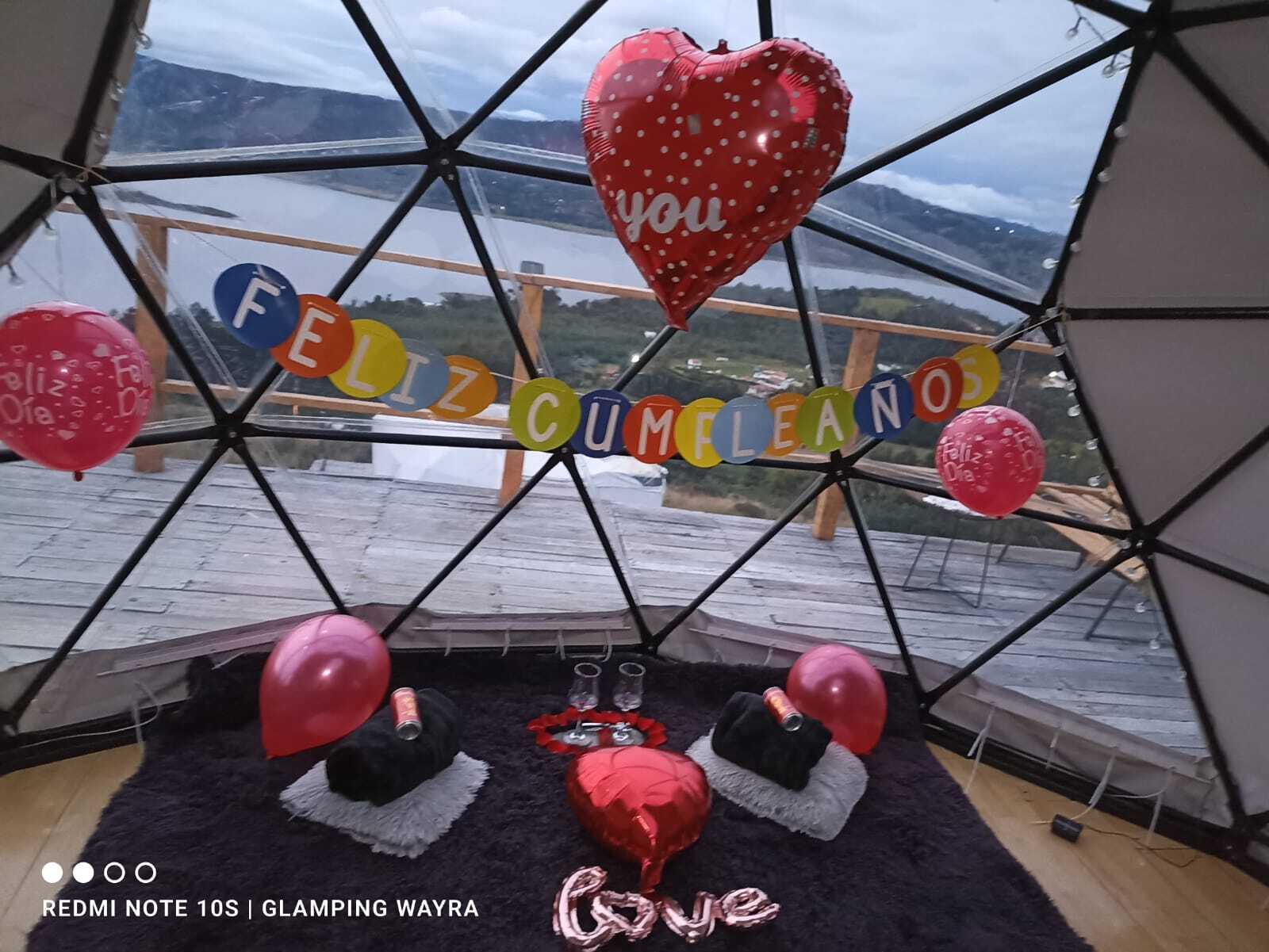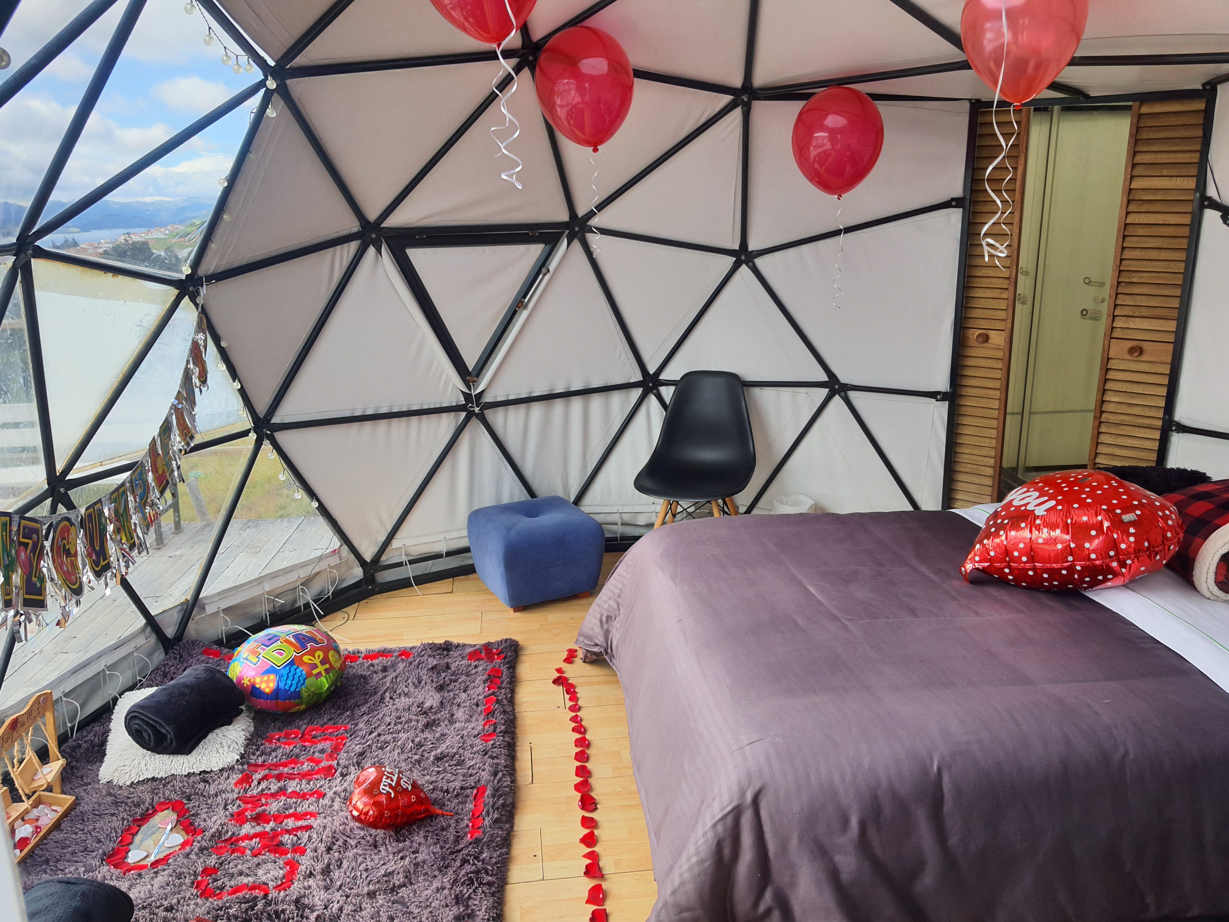 Glamping with double bed, private bathroom, terrace, and bioethanol fireplace with a direct view of the Tomine reservoir and the town of Guatavita, with access from the town by an ancestral stone path or by vehicle on an unpaved road.