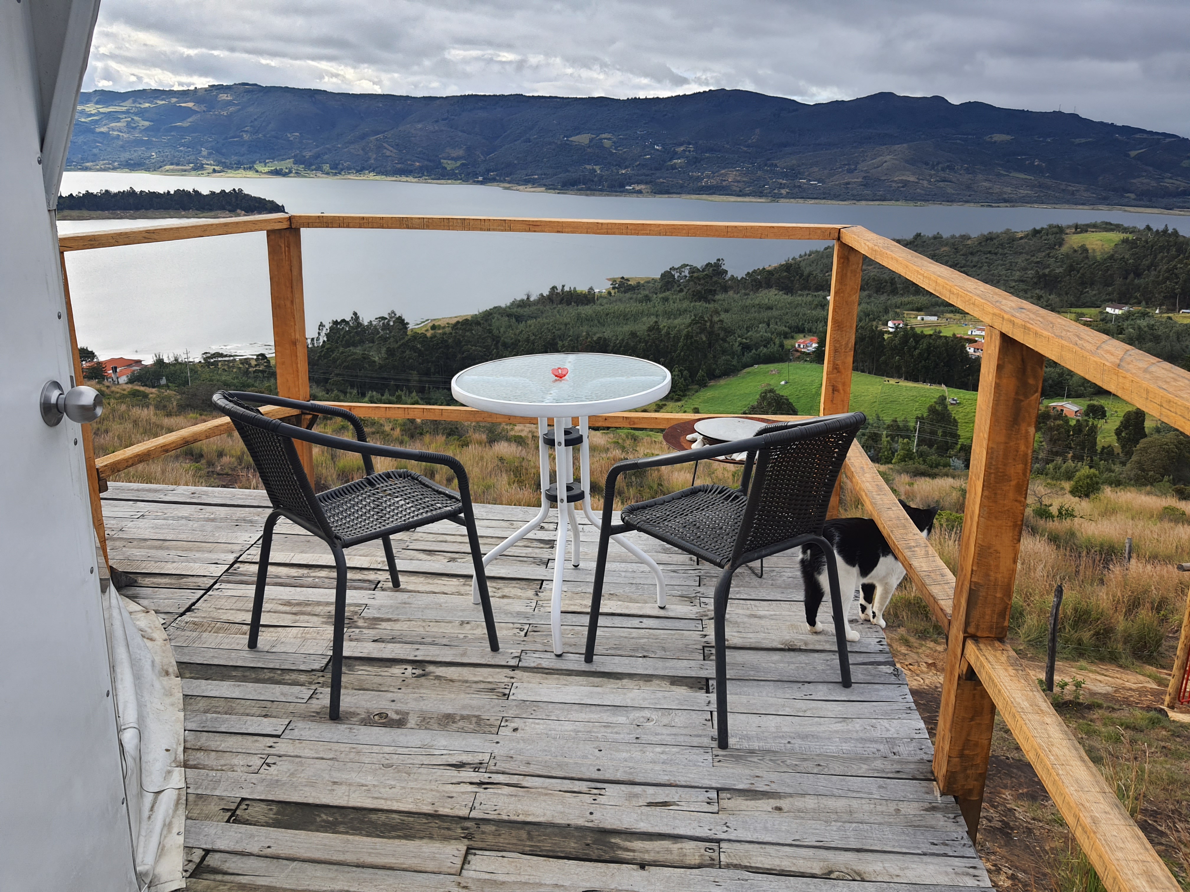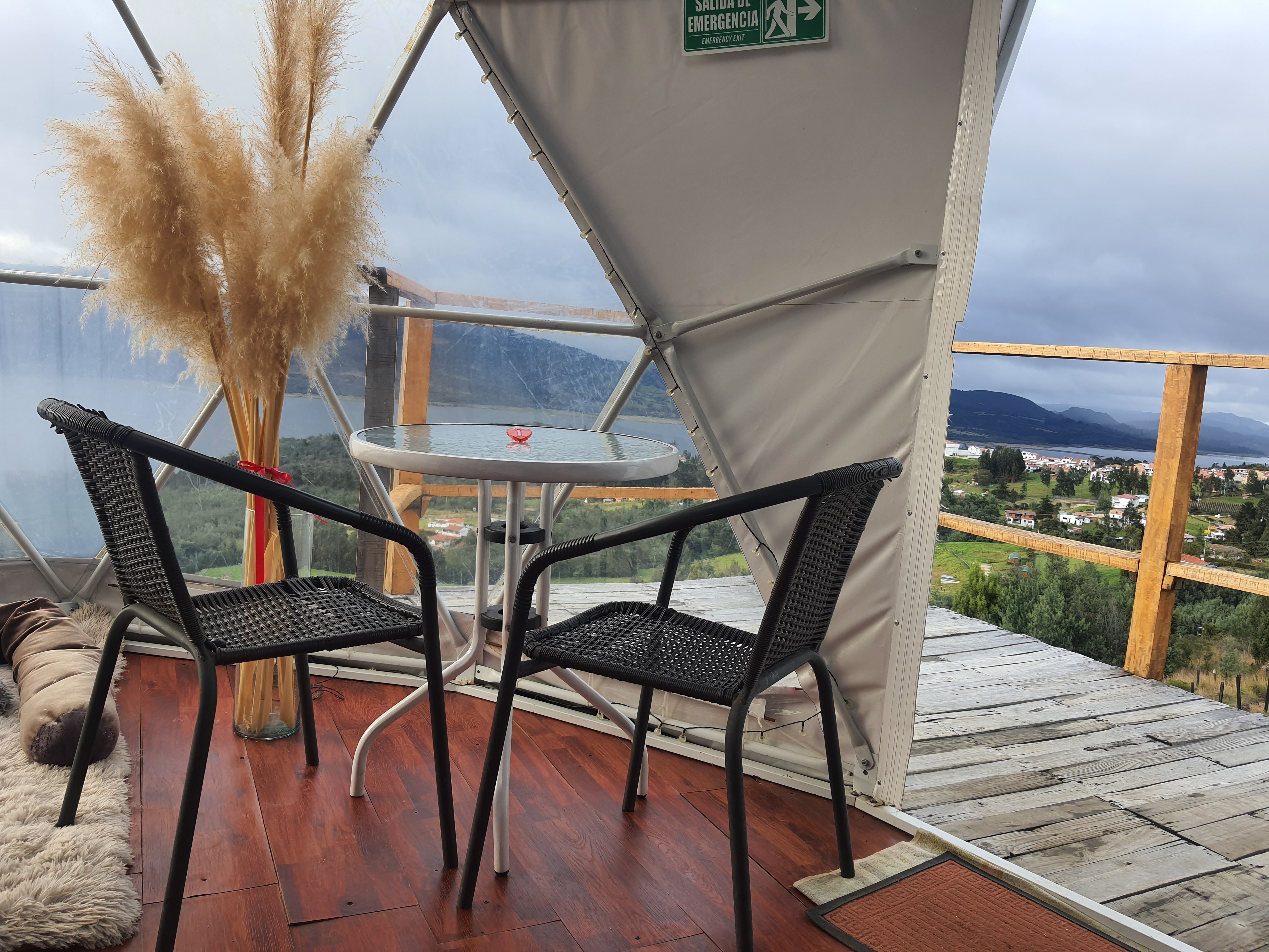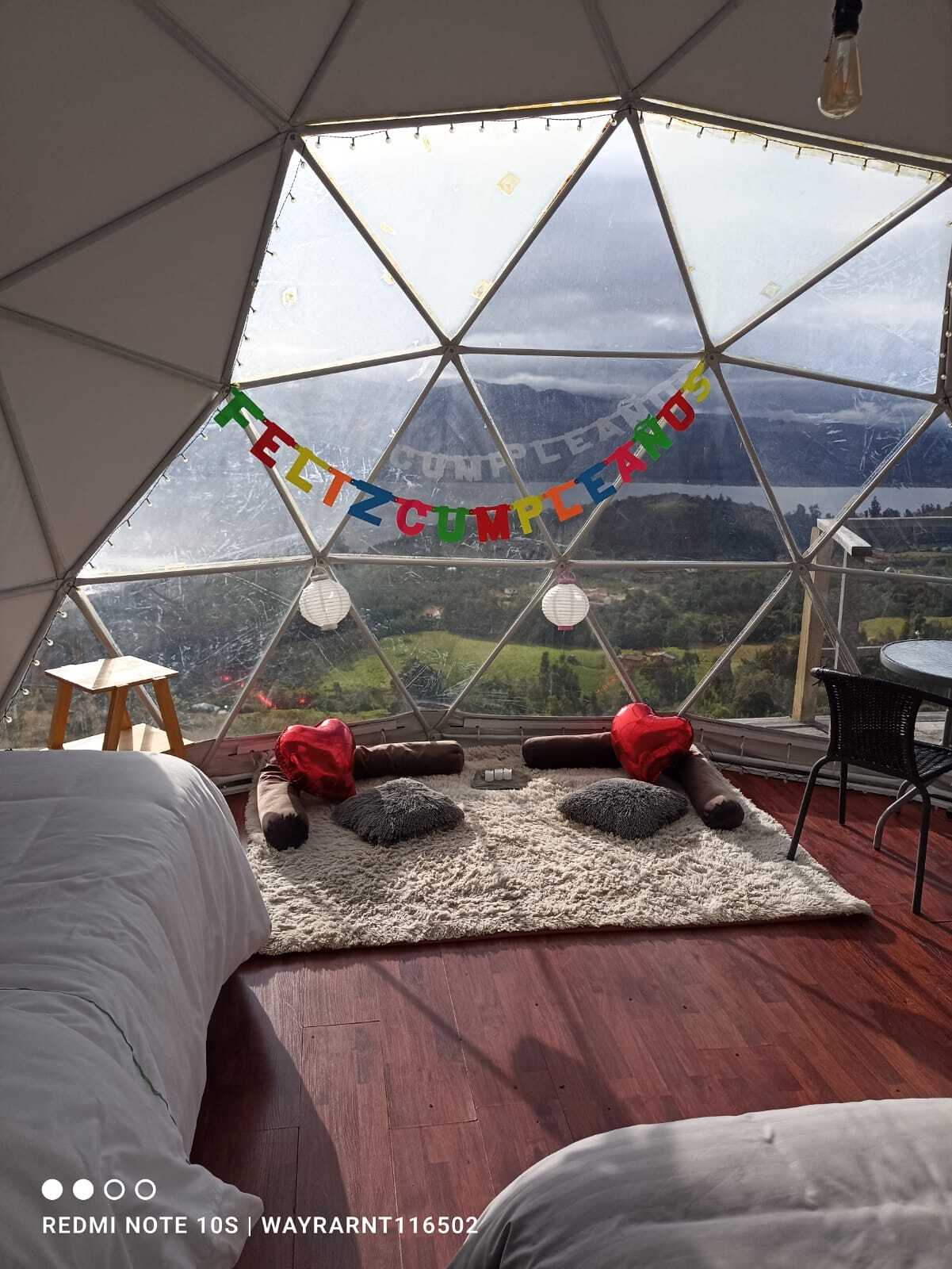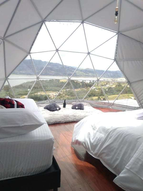 Glamping with a double bed and a single bed, private bathroom with bathtub, terrace, and bioethanol fireplace with direct view to the Tomine reservoir and the town of Guatavita, with access from the town through an ancestral stone path or by vehicle on an unpaved road.